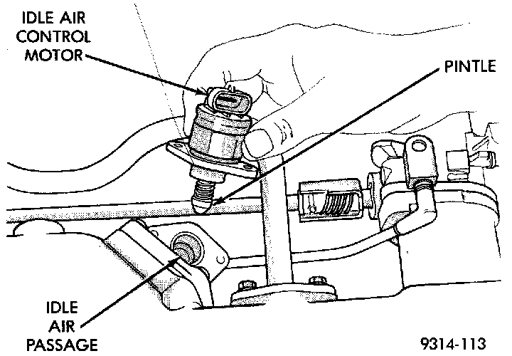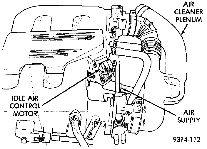 The idle air control motor and housing attaches to the rear of the intake manifold plenum (Fig. 27). The housing opens to the rear runner in the intake manifold plenum. A hose from the air cleaner plenum supplies filtered air to idle air control motor housing. The idle air control motor pintle protrudes into the housing and regulates air flow through it (Fig. 28).