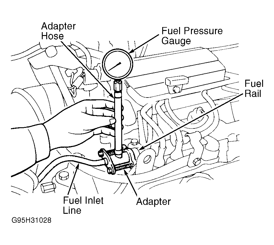 9. When fuel pressure test is complete, repeat fuel pressure release procedure before disconnecting fuel pressure gauge. Install NEW "O" ring at end of high pressure hose. Check for fuel leaks.