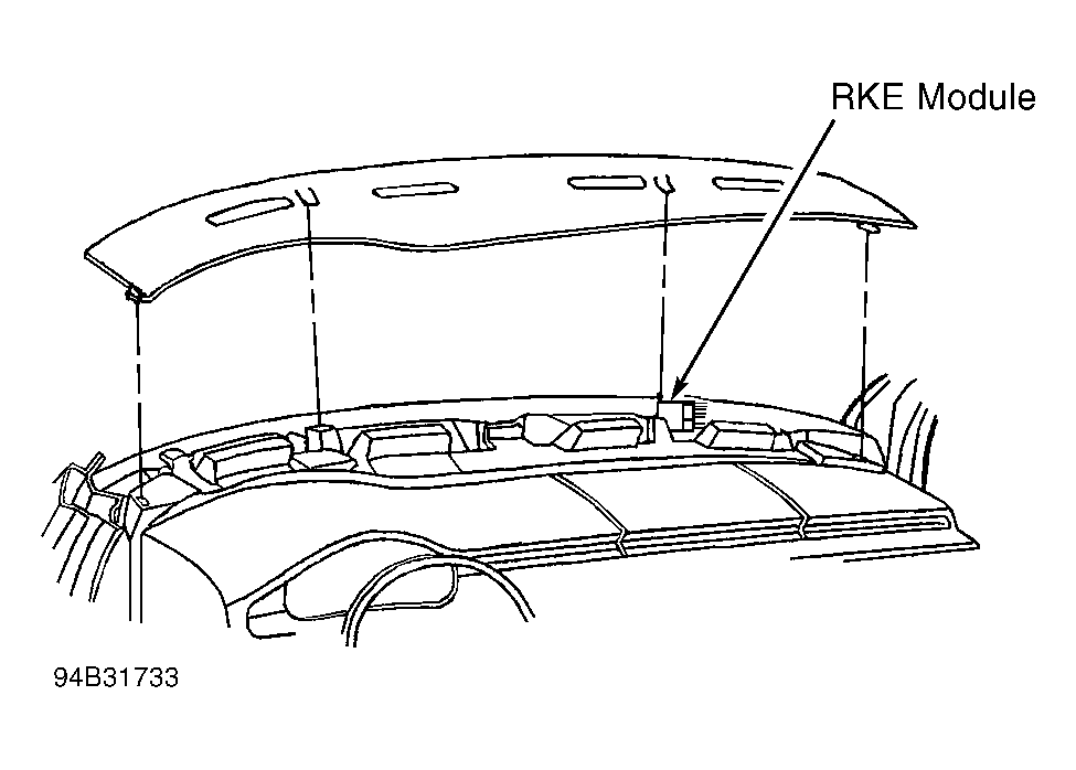 1. If vehicle is equipped with Remote Keyless Entry (RKE) module, go to TEST 95A  . To locate RKE module, see Figure . If vehicle is not equipped with RKE module, open front windows. Close all doors. Go to next step. 2) Lock and unlock both front doors at door lock switches. If doors fail to lock or unlock properly, perform appropriate test listed in TEST 87A DIAGNOSTIC DIRECTORY table. If doors lock and unlock properly, go to next step.