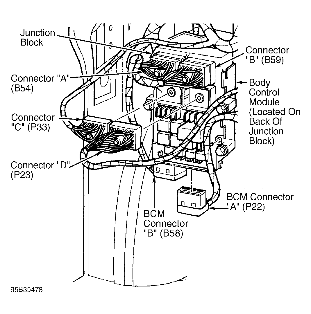 Connect jumper wire between ground and terminal No. 5 (Gray/Black wire) on RKE module harness connector. Disconnect Body Control Module (BCM) connector "A". BCM is located with junction block under driver's side instrument panel. See Figure . Using scan tool in ohmmeter mode, measure resistance at terminal No. 37 (Gray/Black wire) on connector "A". If resistance is 5 ohms or greater, repair open Gray/Black wire. If resistance is less than 5 ohms, replace RKE module.