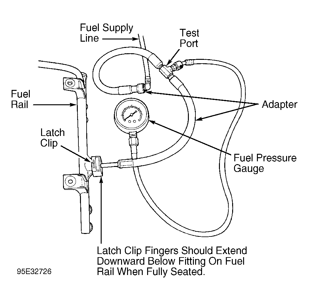 - Release fuel pressure. See FUEL PRESSURE RELEASE under FUEL SYSTEM. Remove latch clip. Remove test equipment. Before reinstalling fuel supply line, ensure fuel supply line fitting and fitting on fuel rail are clean.