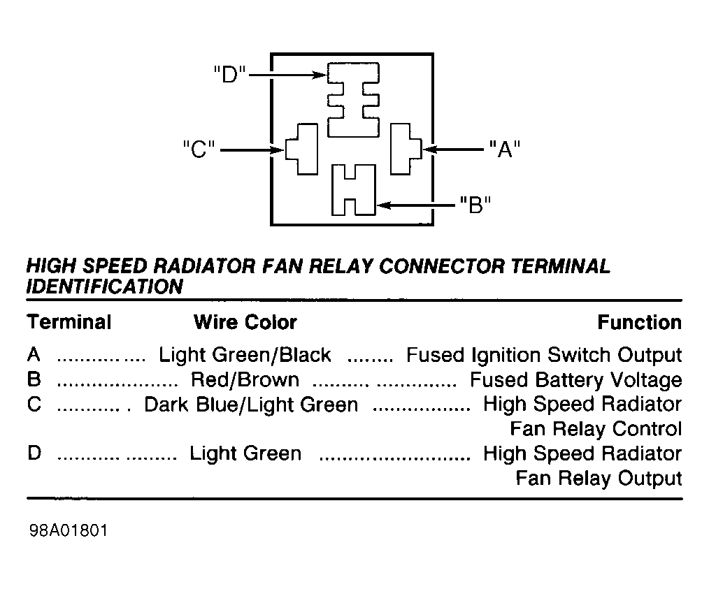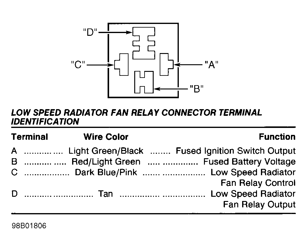 Courtesy of CHRYSLER CORP. LOW SPEED RADIATOR FAN RELAY CONNECTOR TERMINAL IDENTIFICATION