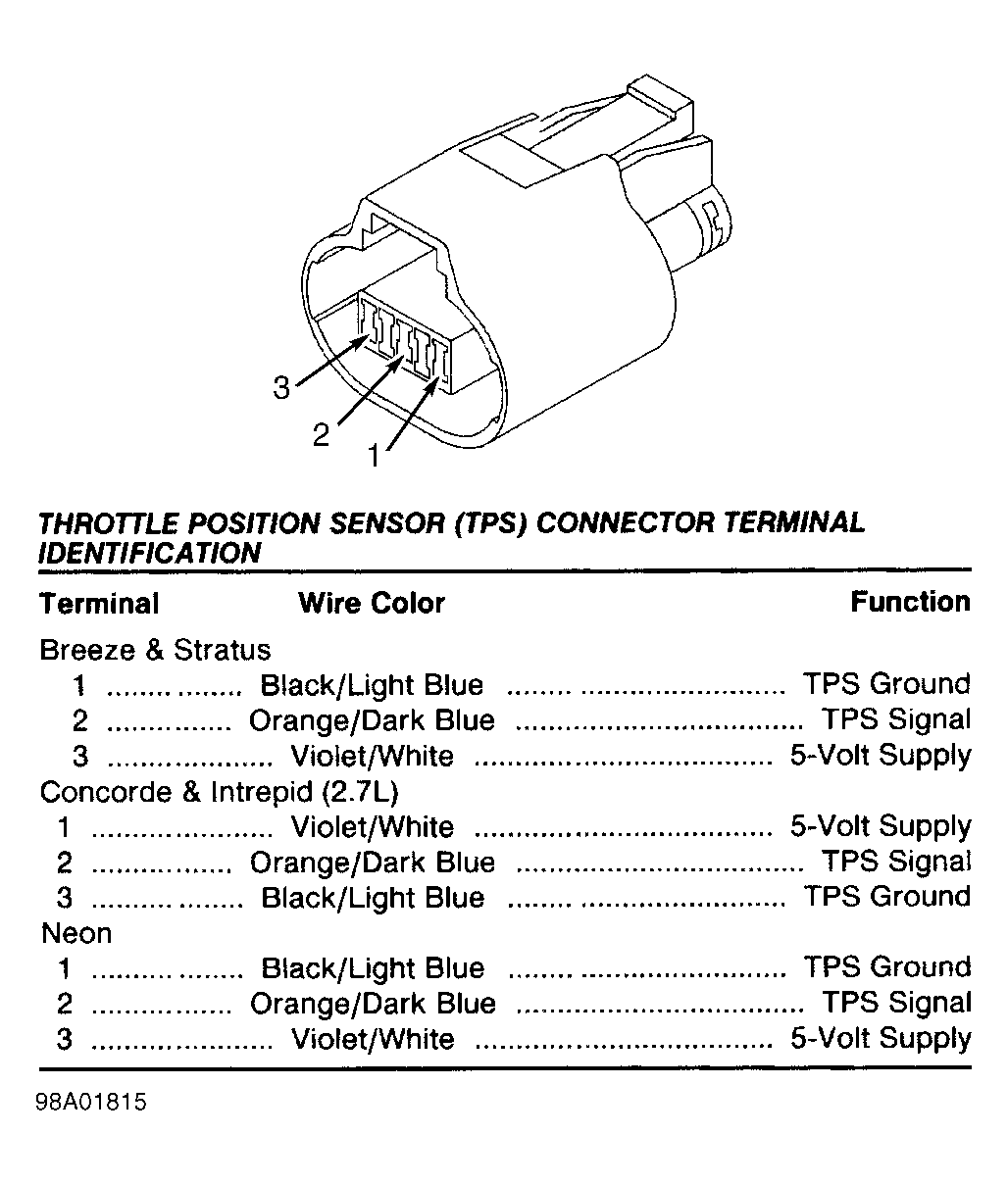 Courtesy of CHRYSLER CORP. THROTTLE POSITION SENSOR (TPS) CONNECTOR TERMINAL IDENTIFICATION