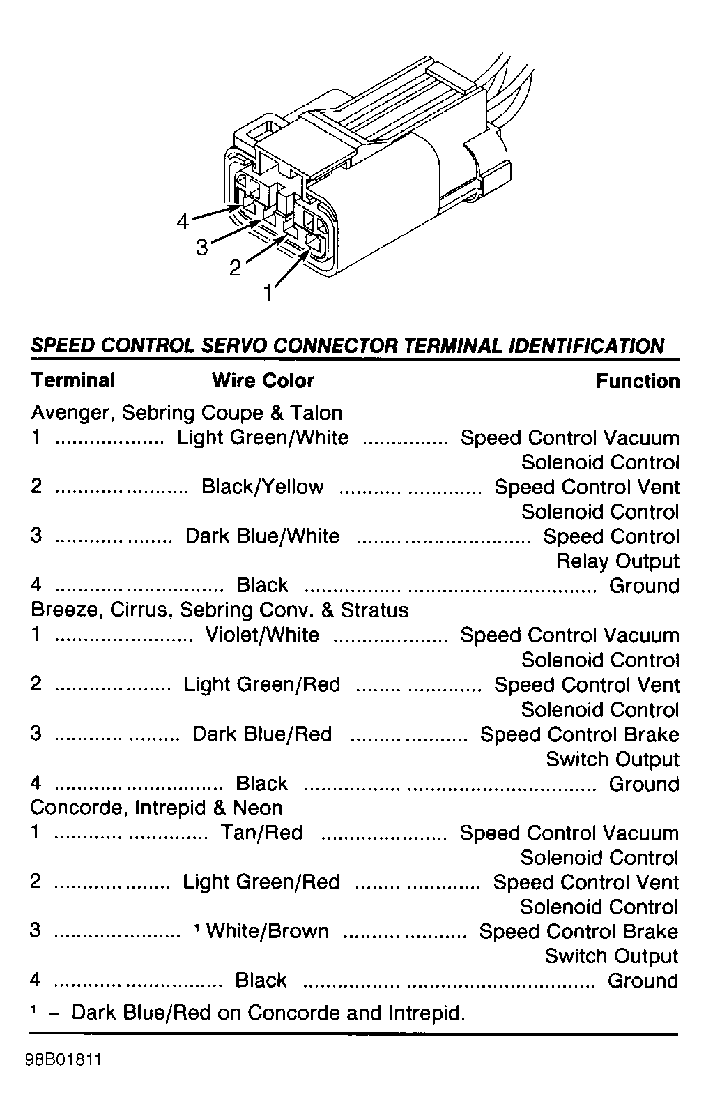 Courtesy of CHRYSLER CORP. SPEED CONTROL SERVO CONNECTOR TERMINAL IDENTIFICATION