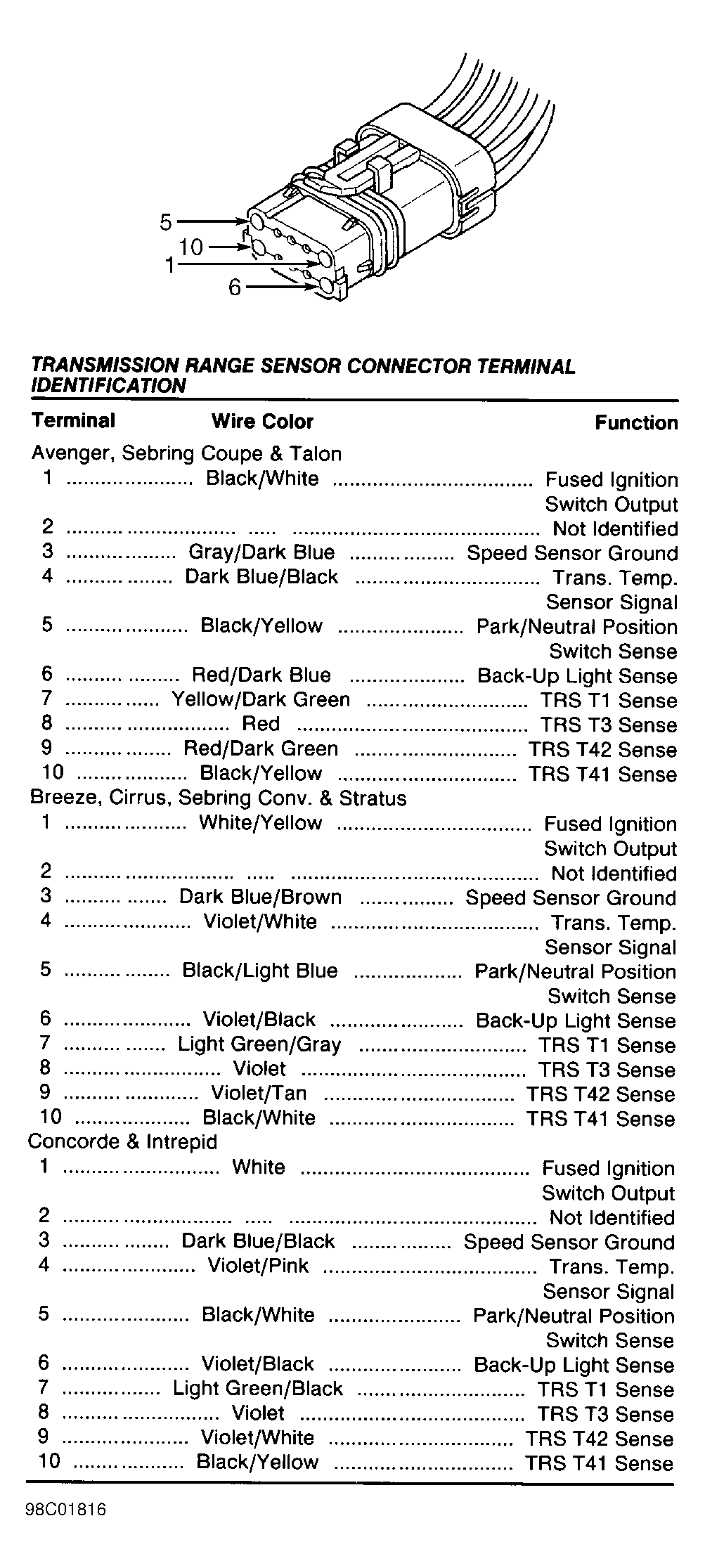 Courtesy of CHRYSLER CORP. TRANSMISSION RANGE SENSOR CONNECTOR TERMINAL IDENTIFICATION