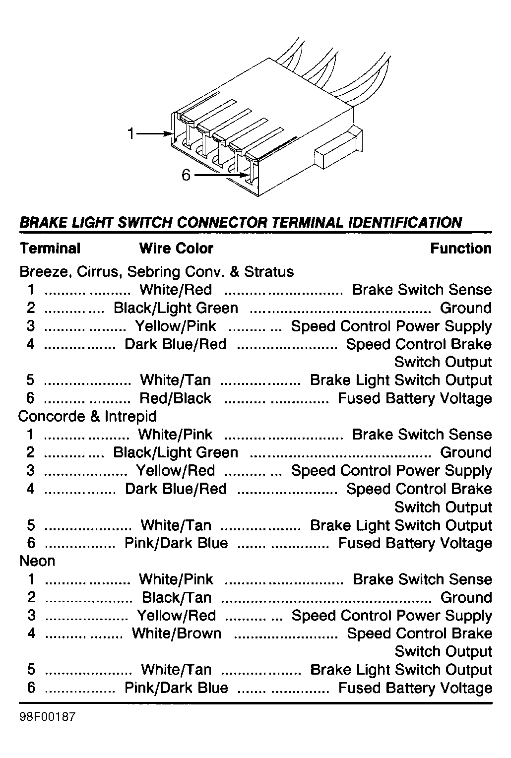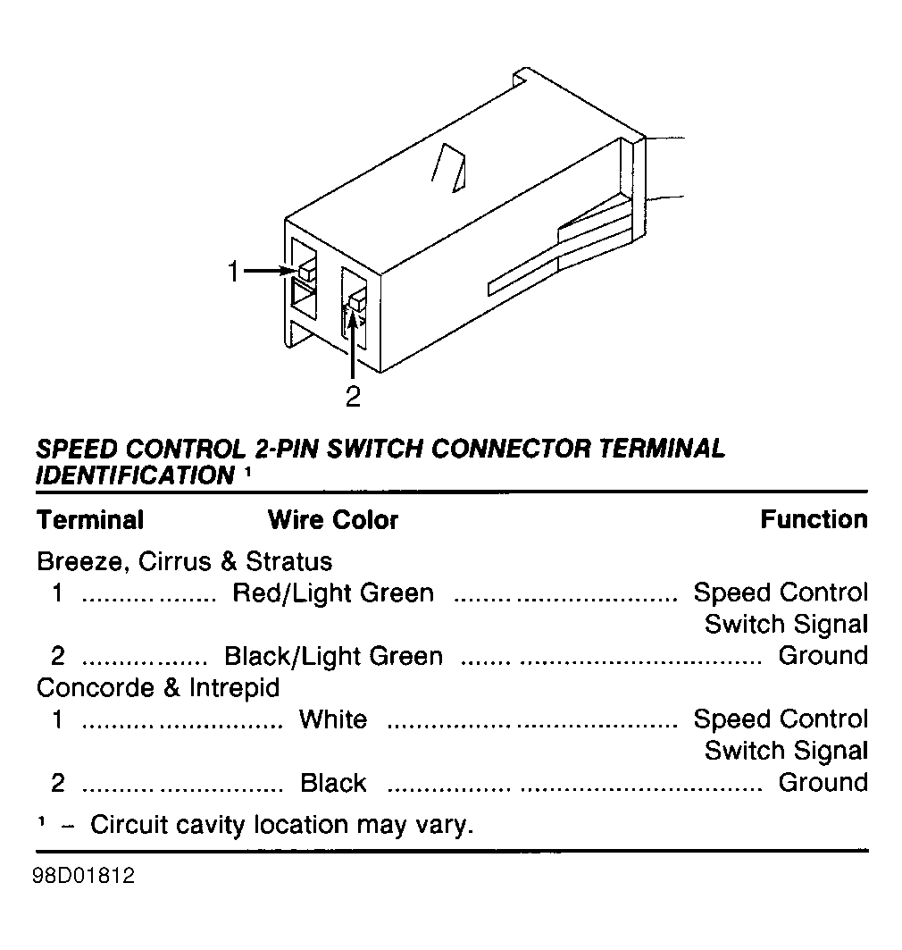 Courtesy of CHRYSLER CORP. SPEED CONTROL 2-PIN SWITCH CONNECTOR TERMINAL IDENTIFICATION