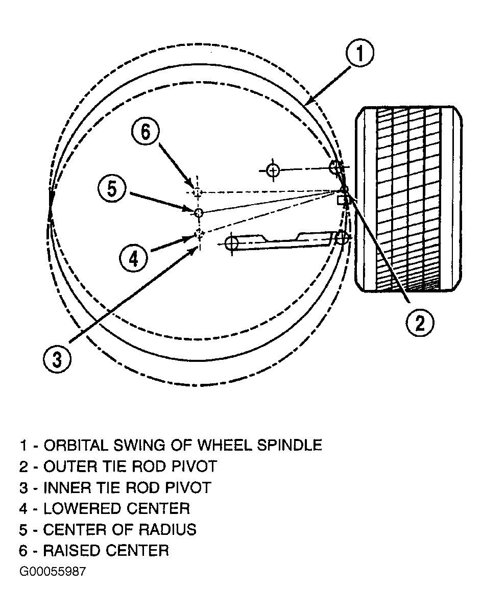 Toe pattern is regulated by vertical positioning of inner tie rod pivot in relation to orbital swing of wheel spindle. See Fig 1 . Wheel toe settings have no effect on toe pattern. When suspension is fully compressed and then extended with tie rod disconnected from spindle, spindle makes an arc in space without altering toe pattern. When arc of spindle is extended into a full circle and inner tie rod end is positioned in center of circle, toe pattern cannot change. When inner tie rod end is raised or lowered from center of true circle of spindle arc, toe pattern will vary. When suspension is compressed (jounce), wheel toe should change from normal riding height. When suspension is extended (rebound), wheel toe should move in opposite direction. The front suspension jounce should cause toe-out, rebound should cause toe-in. Rear suspension jounce should cause toe-in, rebound should cause toe-out.