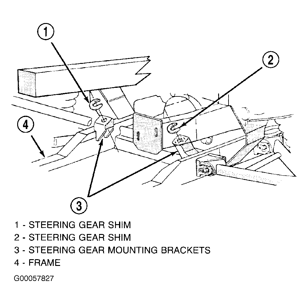 Front wheel toe pattern is critical in controlling a vehicle's directional stability, as vehicles suspension moves through normal jounce and rebound travel. Toe pattern adjustment is done by installing (0.5, 1.0, 1.5, or 3.0 mm) shims between steering gear and steering gear mounting brackets. See Fig 1. A maximum of 9.5 mm (.375") shimming is allowed between steering gear and its mounting brackets. If steering gear is removed for any reason or a replacement steering gear is installed, same thickness of shim MUST be reinstalled between steering gear and mounting brackets. This is necessary to maintain correct front wheel toe pattern of vehicle, which is set during vehicle's assembly alignment procedure.