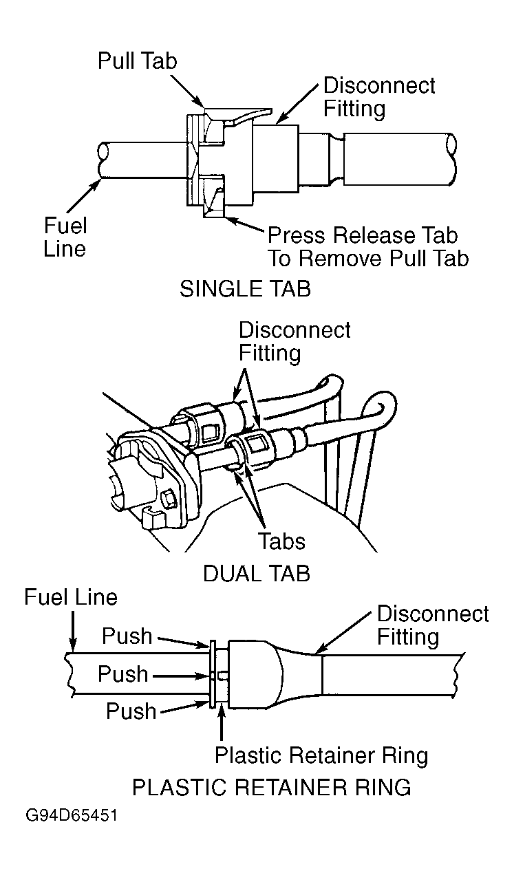 - Firmly push disconnect fitting toward the fuel line while pushing plastic retainer ring evenly into disconnect fitting. With plastic retainer ring fully depressed, pull disconnect fitting from fuel line.