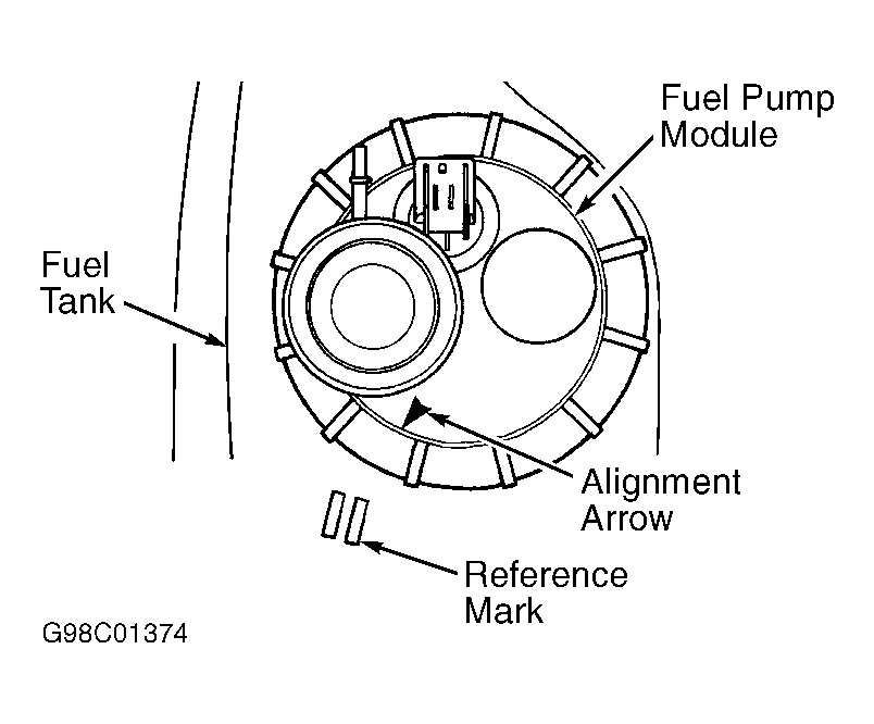 - Rotate fuel pump module so alignment mark on fuel pump module aligns with reference mark on fuel tank. See Fig 1. Install and hand tighten fuel pump module lock nut.