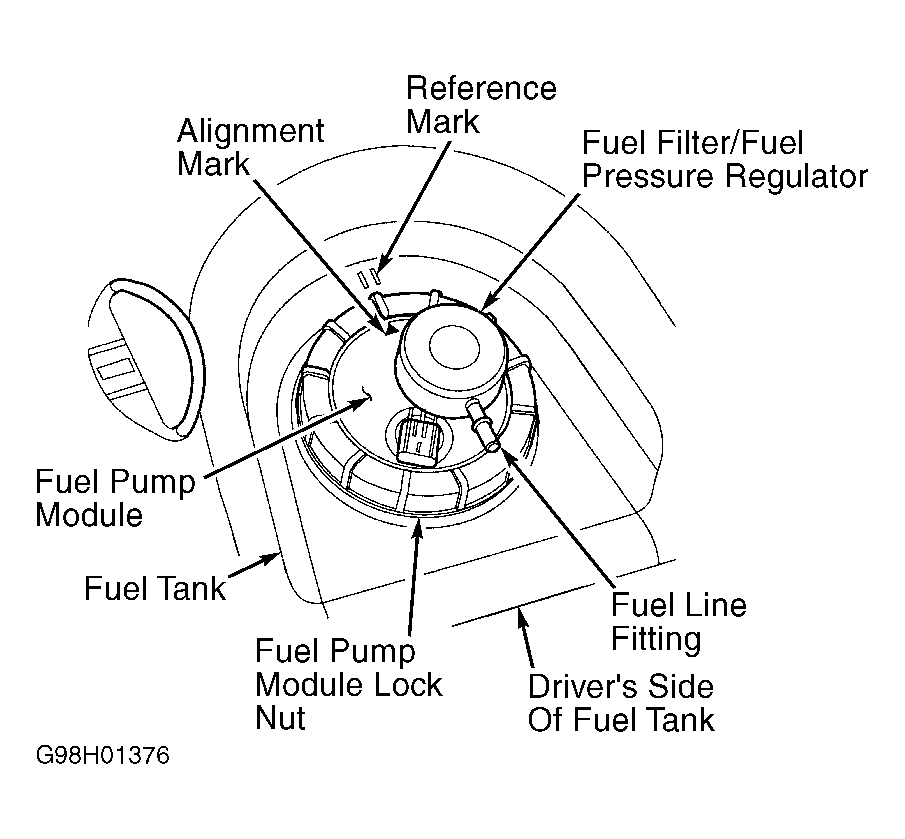 - Note location of fuel pressure regulator on fuel pump module. See Figure. Ensure fuel filter/pressure regulator is positioned on fuel pump module so fuel line fitting on side fuel filter/fuel pressure regulator points toward driver's side of fuel tank.