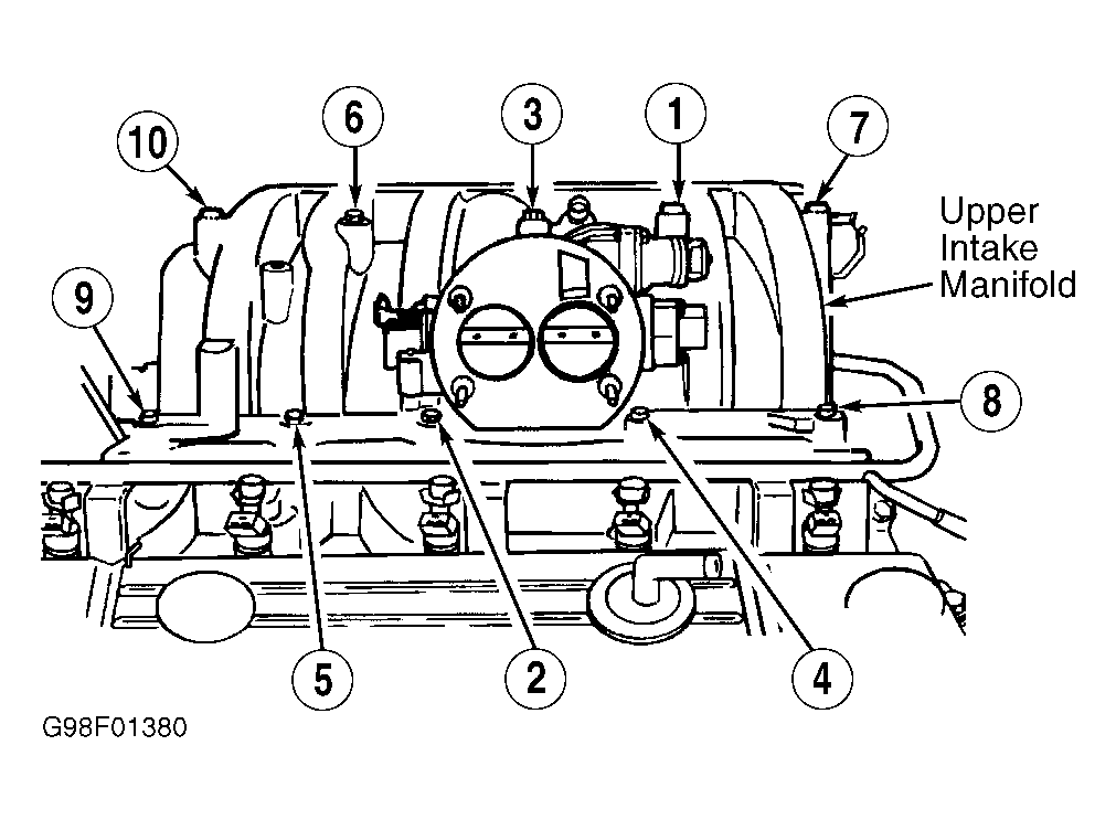 - Tighten fuel rail bolts to specification. See TORQUE SPECIFICATIONS . Using NEW gasket, install upper intake manifold with all bolts loosely installed. Tighten upper intake manifold bolts to specification in sequence. See Fig 1. See TORQUE SPECIFICATIONS .