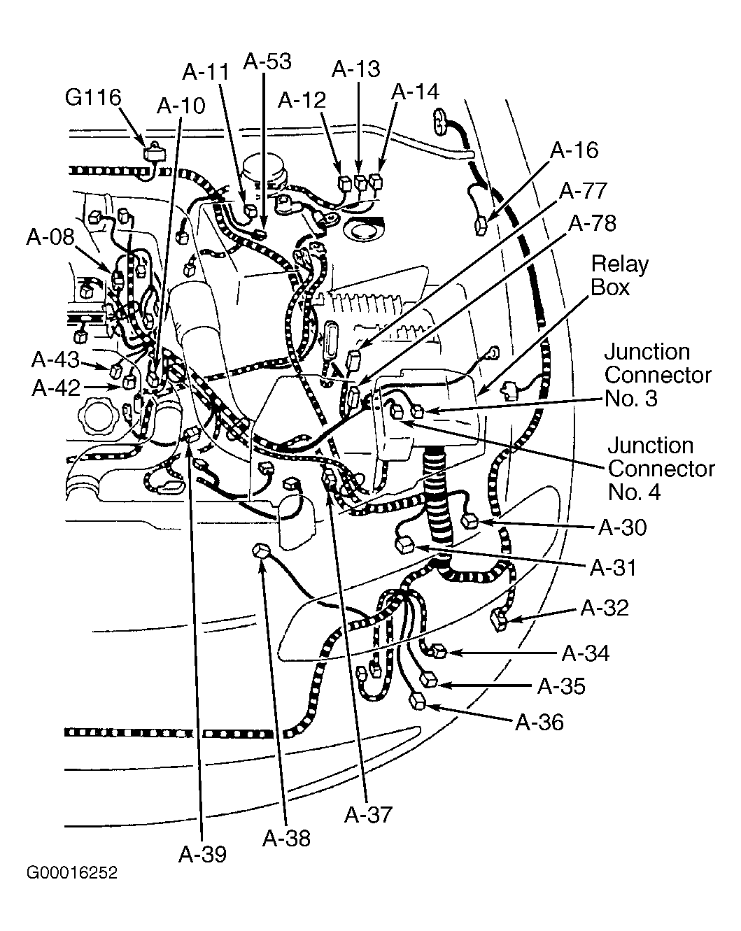 - Inspect junction connector No. 4 for damaged wires or terminals. Junction connector No. 4 is located under relay box in left front corner of engine compartment. Inspect in-line harness connector A-37 for damaged wires or terminals. In-line harness connector A-37 is located at left front corner of engine compartment, under air cleaner. See Figure. If problem does not exist, go to next step. If problem exists, repair connector(s) as necessary.