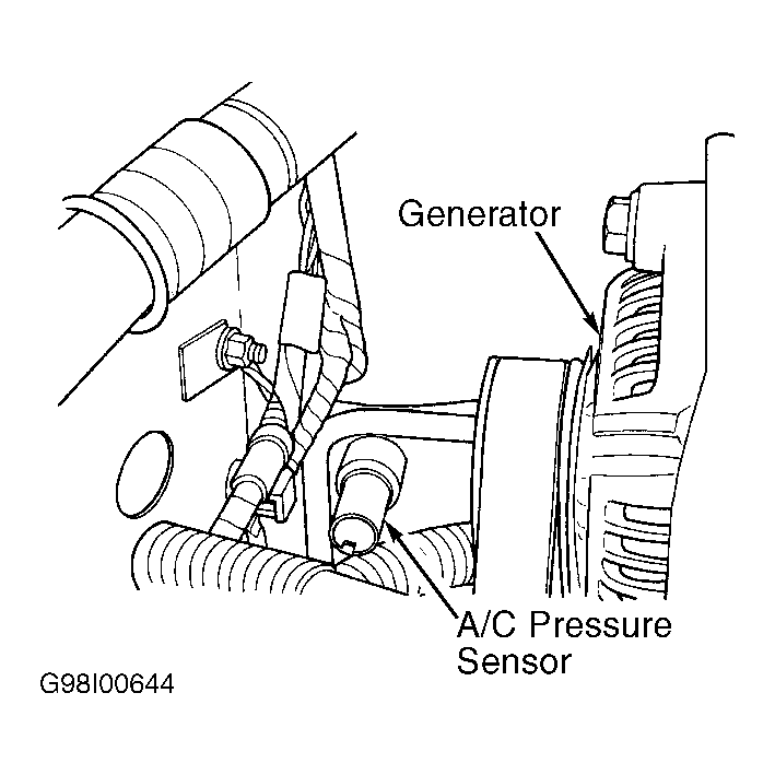 - Turn ignition off. Disconnect A/C pressure sensor connector. A/C pressure sensor is located on A/C refrigerant line on firewall, near front of generator. See Fig 1 .