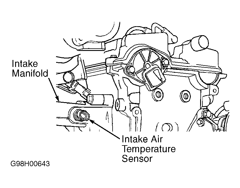 - Remove intake air temperature sensor from intake manifold. Intake air temperature sensor is screwed into rear of intake manifold, near cylinder head and contains a 2-pin connector. See Fig 1 .