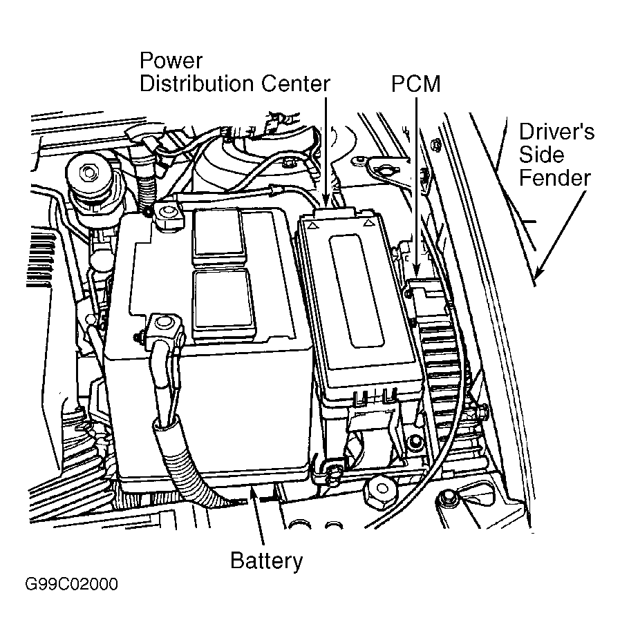 Powertrain Control Module (PCM) is located between driver's side front fender and power distribution center, near battery. See Fig 1 . If Powertrain Control Module (PCM) is replaced, PCM must be properly programmed. SeePOWERTRAIN CONTROL MODULE PROGRAMMING  under PROGRAMMING.