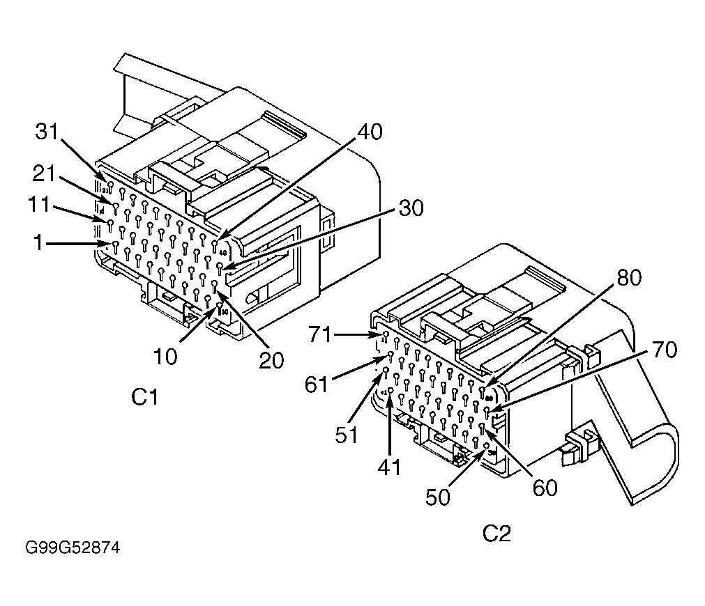 - Turn ignition off. Disconnect Powertrain Control Module (PCM) connectors. PCM is located in engine compartment between left inner fender and power distribution center. Inspect terminals No. 59 and 60 at PCM connector C2 for damaged pins, corrosion and loose terminals. See Figure . Repair connector as necessary. If connector is okay, connect a jumper wire between ground and terminal No. 59 (Violet/Brown wire) PCM connector C2. Using scan tool, perform CCD BUS TEST. If scan tool displays SHORT TO GROUND, disconnect jumper wire and go to next step. If scan tool does not display SHORT TO GROUND, repair open in Violet/Brown wire.