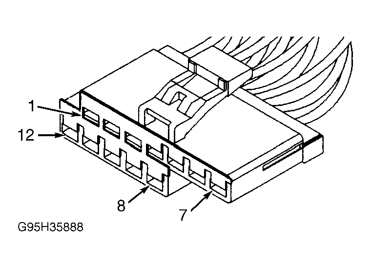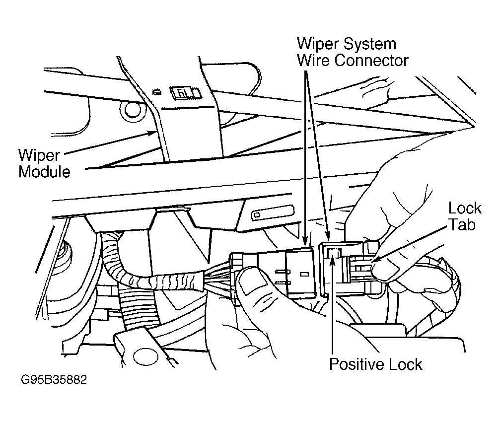 6. Disconnect wiper module connector. See Figure . Inspect connector for damaged pins, corrosion and loose terminals. Repair connector as necessary. If connector is okay, connect a jumper wire between wiper terminals No. 30 and 87 at high/low relay socket in PDC. Measure voltage between ground and terminal No. 3 (Red/Yellow wire) at wiper module connector. If voltage is more than 10 volts, replace wiper motor. If voltage is 10 volts or less, repair open in Red/Yellow wire between high/low wiper relay and wiper motor module.