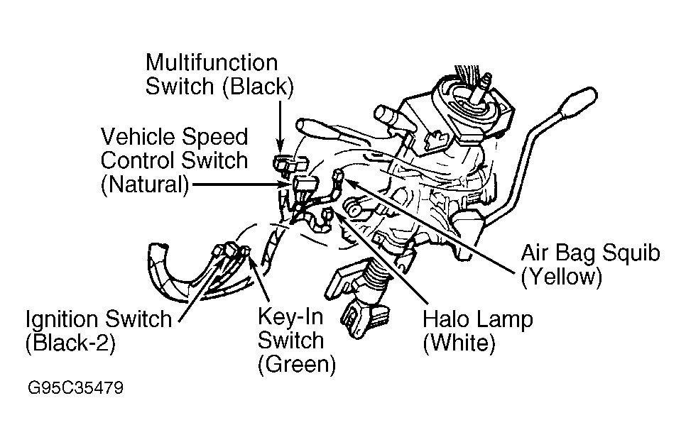 4. Remove lower steering column cover. Disconnect multifunction switch. See Figure . Connect a jumper wire between ground and terminal No. 5 (White wire) at multifunction switch connector. See Figure . Measure resistance between ground and terminal No. 85 at wiper high/low relay socket in PDC. If resistance is less than 5 ohms, go to next step. If resistance is 5 ohms or more, repair open in White wire between PDC and multifunction switch.