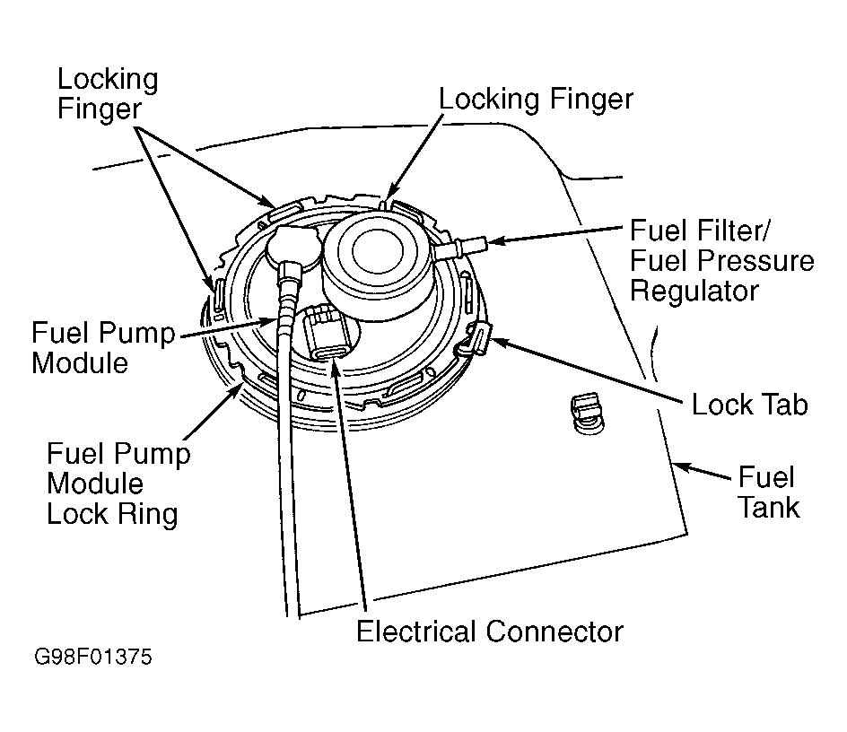 - Note location of metal fuel pump module lock ring and locking fingers on fuel tank. See Figure. There are 6 locking fingers molded into plastic fuel tank.