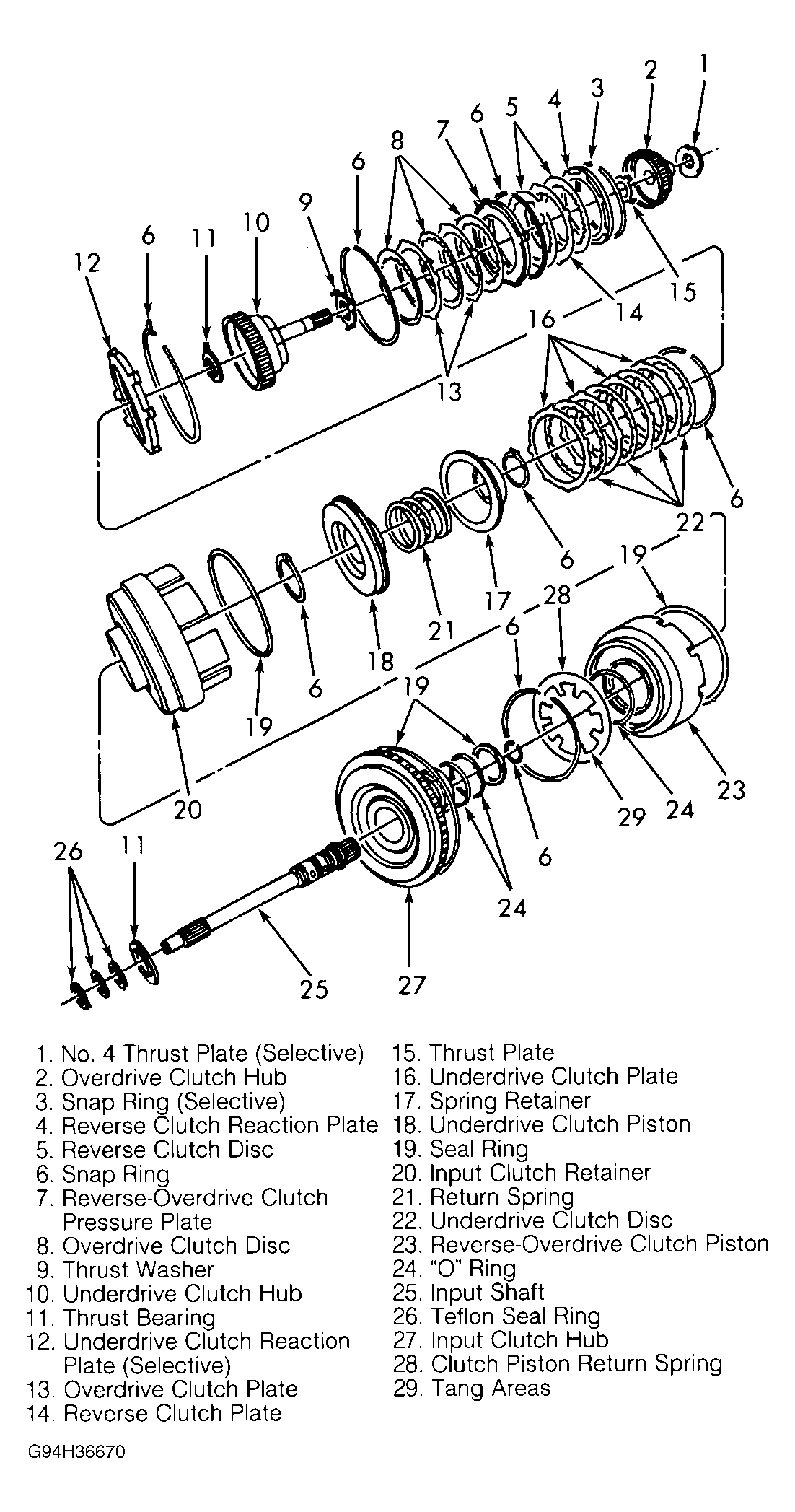 - To complete final assembly, reinstall overdrive and reverse clutch components. Ensure all clutch components are installed in original location as when clutch clearances were checked. Install No. 4 thrust plate on overdrive clutch hub. See Figure .