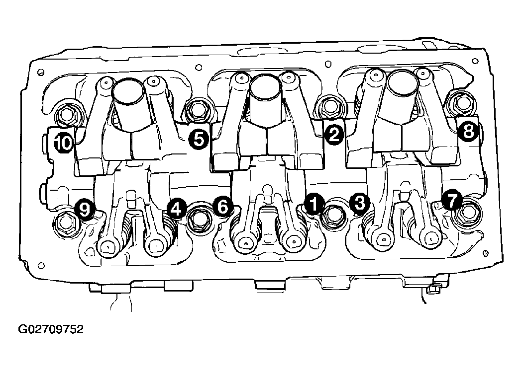 - Tighten rocker arm/shaft assembly bolts in sequence to 31 N.m (275 in. lbs.) (Fig 2).