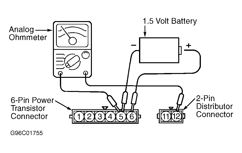 3. Disconnect transistor wiring connector. Connect a 1.5-volt battery positive terminal to transistor terminal No. 6. See Fig 1 . Connect negative battery terminal to transistor terminal No. 5. Using an analog ohmmeter, check for continuity between transistor terminals No. 5 and No. 12. Continuity should exist. Remove 1.5-volt battery. Check for continuity between transistor terminals No. 5 and No. 12. Continuity should not exist. Replace transistor if continuity is not as specified.