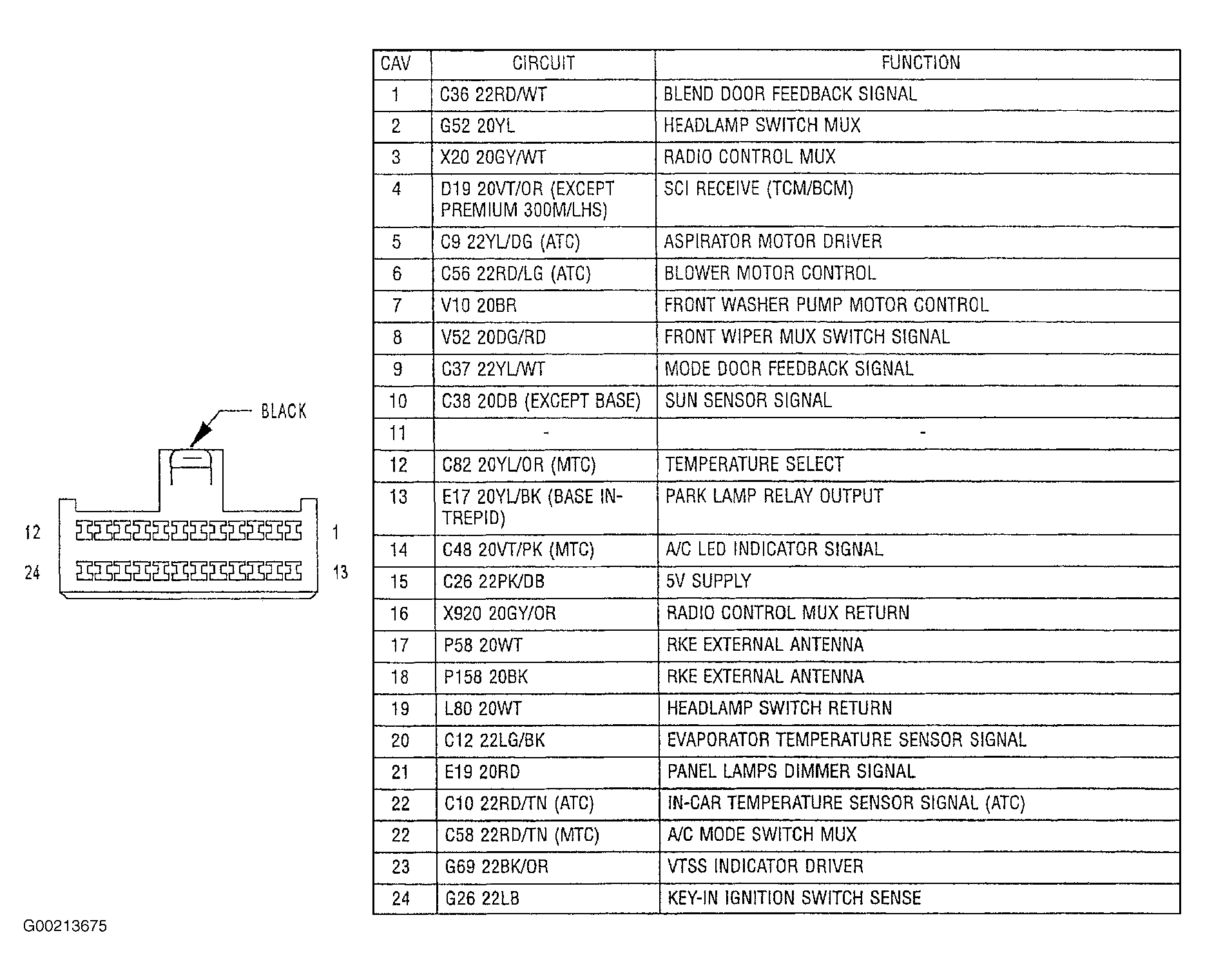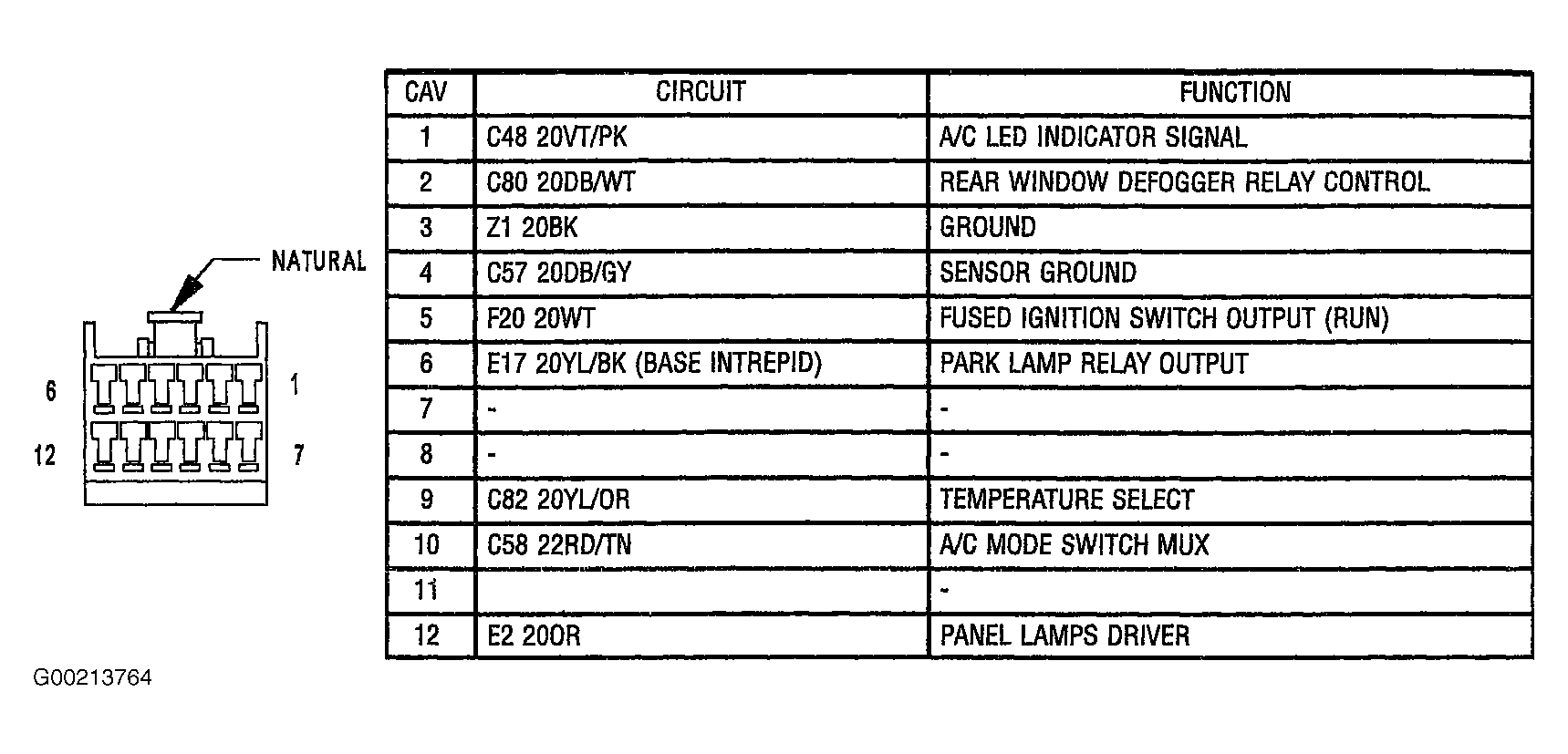 2. Disconnect the manual temp control head C1 harness connector. See Figure . With the scan tool, read the Mode Switch MUX voltage. If the scan tool displays: MODE SWITCH MUX, 4.8 volts or greater, replace the control head. See MANUAL A/C-HEATER SYSTEMS - CONCORDE & INTREPID in HVAC. If 4.8 volts or less, leave manual temp control head C1 connector disconnected and go to next step.