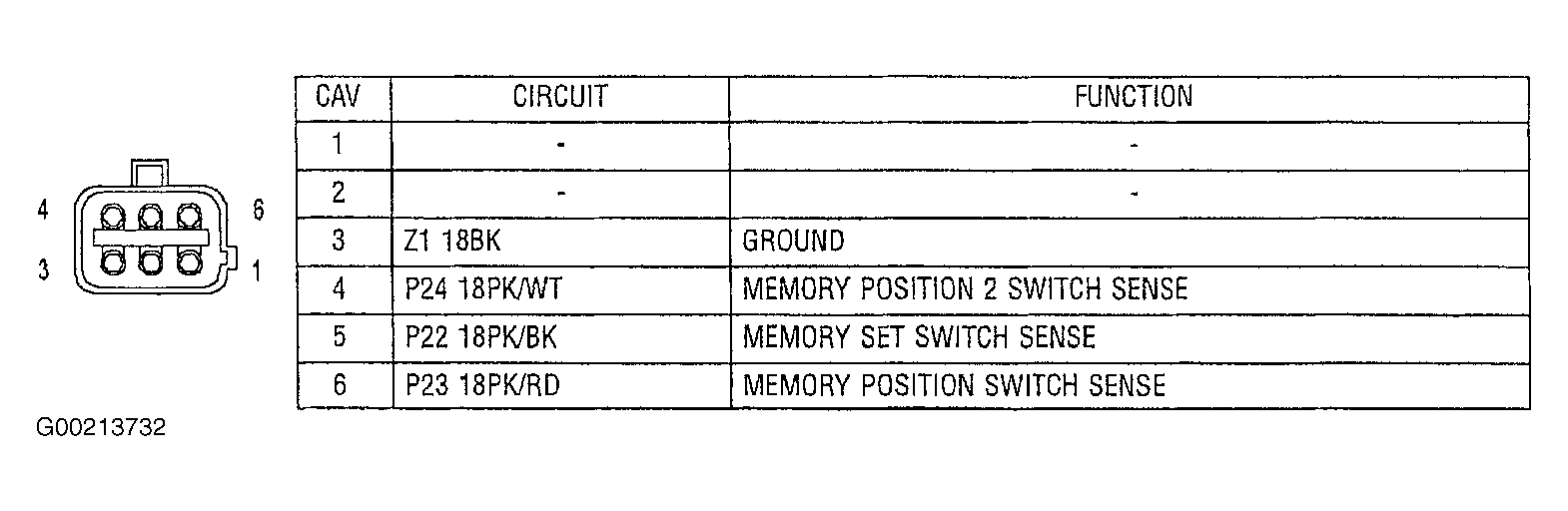 2. Turn ignition on. Measure voltage on memory set switch connector terminal No. 6, memory position 1 switch sense circuit (Pink/Red wire). If voltage is more than 0.5 volt, leave memory set switch connector disconnected and go to next step. If voltage is 0.5 volt or less, go to step  7 .