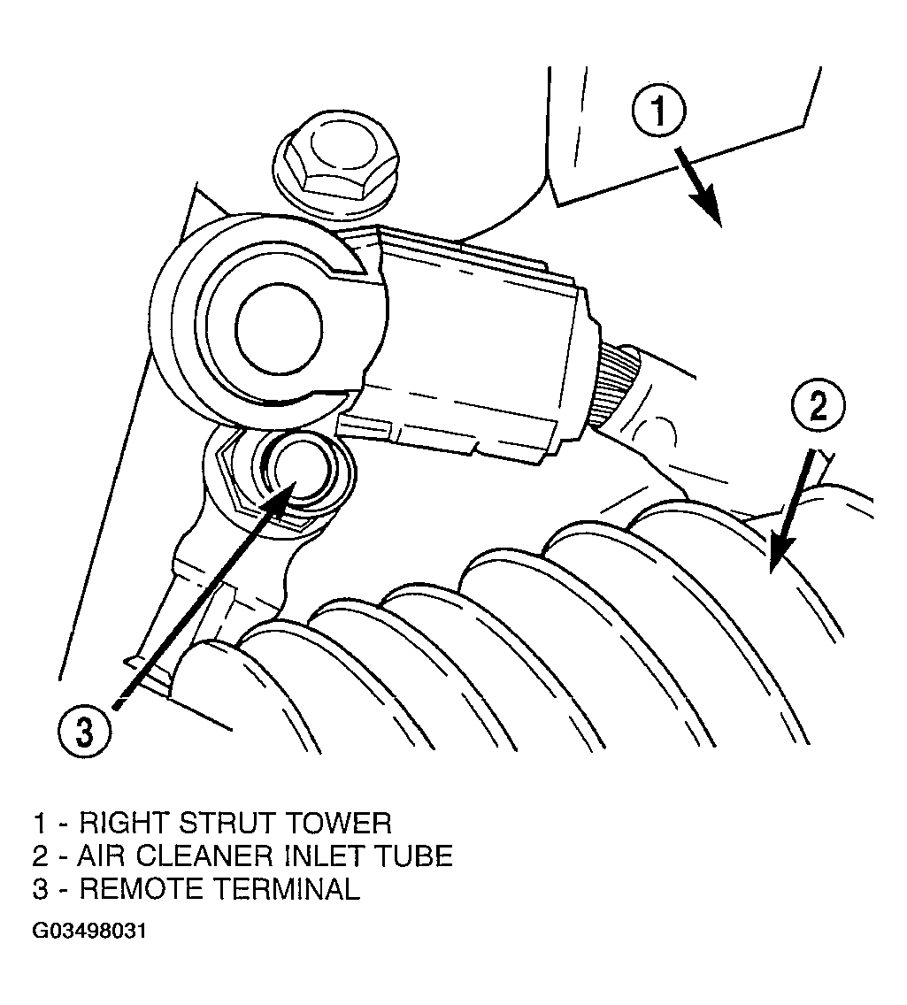 - Open hood and disconnect the negative battery cable remote terminal from the remote battery post (Fig 1 ).