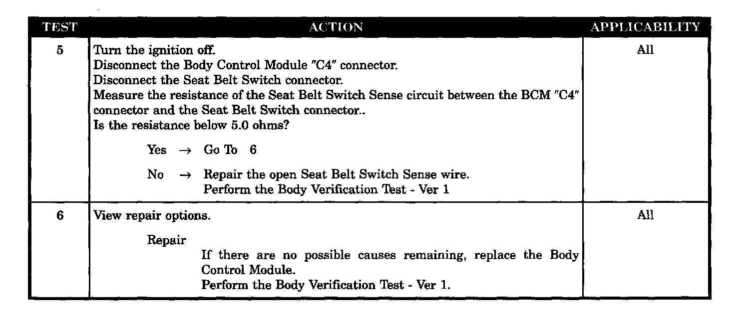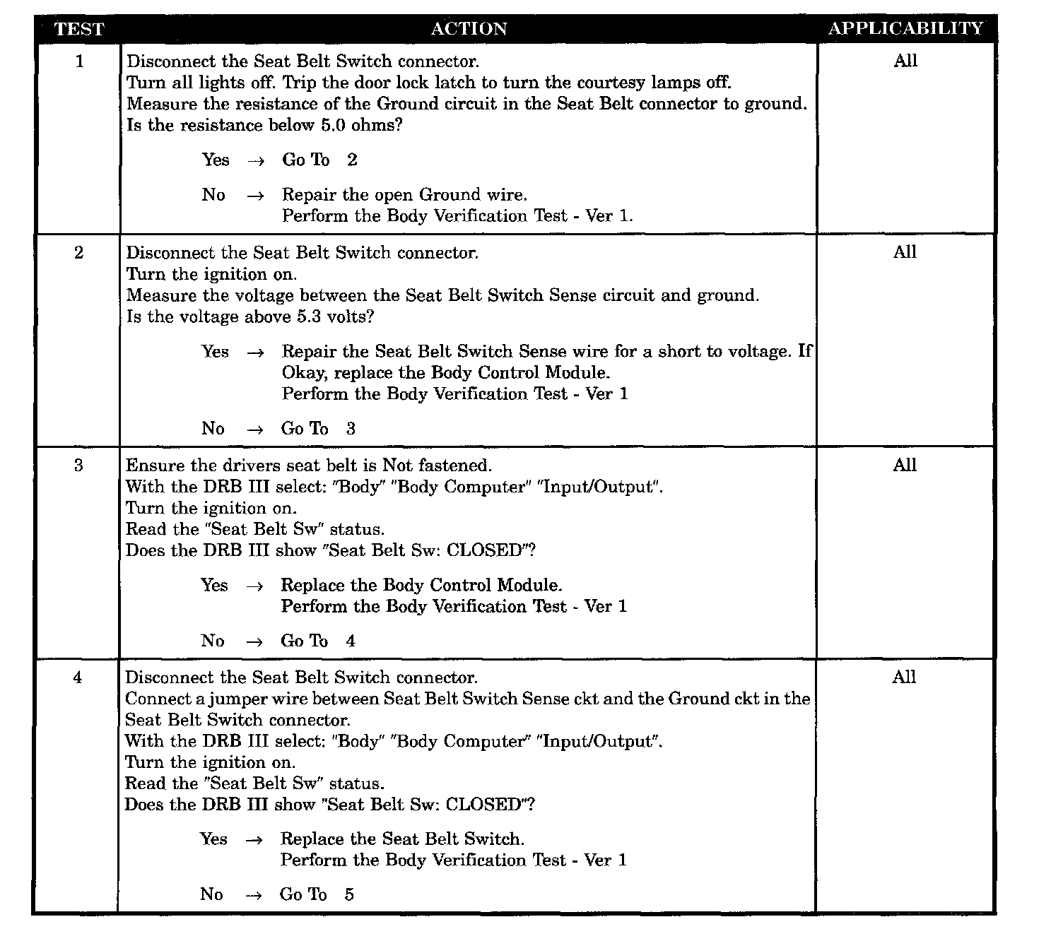 Home >> Dodge and Ram >> 2000 >> Intrepid V6-2.7L VIN R >> Repair and Diagnosis >> Powertrain Management >> Computers and Control Systems >> Relays and Modules - Computers and Control Systems >> Body Control Module >> Testing and Inspection >> Symptom Related Diagnostic Procedures >> Chime Inoperative With Drivers Seat Belt Unfastened