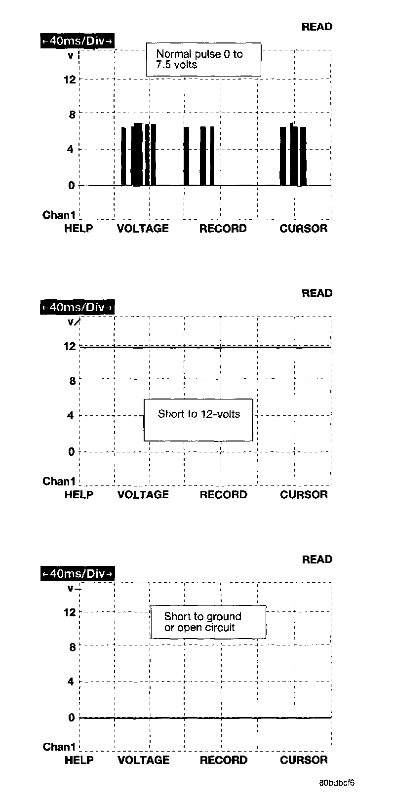 Each module provides its own bias and termination in order to transmit and receive messages. The bus voltage is at zero volts when no modules are transmitting and is pulled up to about seven and a half volts when modules are transmitting. The bus messages are transmitted at a rate averaging 10800 bits per second. Since there is only voltage present when the modules transmit, and the message length is only about 500 milliseconds, it is ineffective to try and measure the bus activity with a conventional voltmeter. The preferred method is to use DRBIII (R) lab scope. The 12 V square wave selection on the 20-volt scale provides a good view of the bus activity. Voltage on the bus should pulse between zero and about seven and a half volts. Refer to figure 1 for some typical displays.
