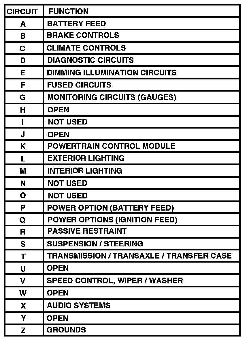 All circuits in the diagrams use an alpha/numeric code to identify the wire and its function. To identify which circuit code applies to a system, refer to the Circuit Identification Code Chart. This chart shows the main circuits only and does not show the secondary codes that may apply to some models.