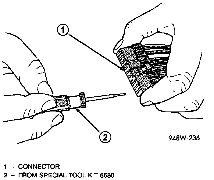 4. Position the connector locking finger away from the terminal using the proper pick from special tool kit 6680. Pull on the wire to remove the terminal from the connector.