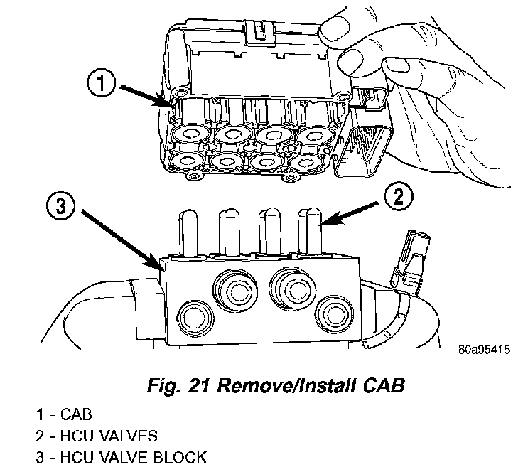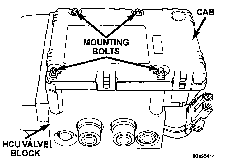 REMOVALNOTE: To replace the Hydraulic Control Unit (HCU) or the Controller Antilock Brake (CAB) on this vehicle, the entire Integrated Control Unit (ICU) needs to be removed from the vehicle. The CAB can then be separated from the HCU. Do not attempt to replace the CAB with the ICU mounted in the vehicle.