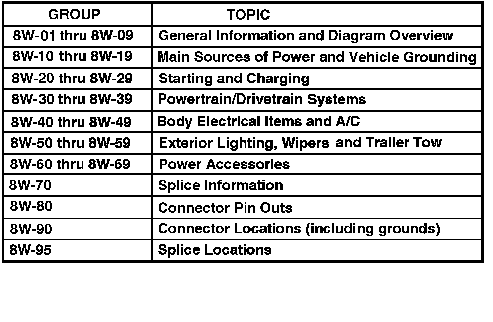 The wiring diagrams are grouped into individual sections. If a component is most likely found in a particular group, it will be shown complete (all wires, connectors, and pins) within that group. For example, the Auto Shutdown Relay is most likely to be found in Group 30, so it is shown there complete. It can, however, be shown partially in another group if it contains some associated wiring.