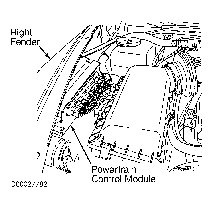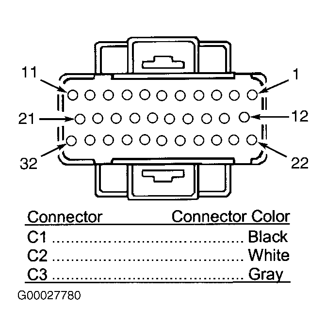 - Turn ignition off. Disconnect Gray 32-pin PCM connector C3. PCM is located in right side of engine compartment. See Fig 1 . Connect Diagnostic Junction Port Tester (8339) to Black 16-pin diagnostic junction port. DO NOT connect diagnostic junction port tester to scan tool. Using DVOM, measure resistance between diagnostic junction port tester and Gray 32-pin PCM connector C3 terminal No. 30 (Violet/Yellow wire). See Fig 2 . If resistance is 5 ohms or less, replace PCM. See POWERTRAIN CONTROL MODULE under REMOVAL & INSTALLATION. If resistance is more than 5 ohms, repair open in PCI BUS circuit (Violet/Yellow wire).