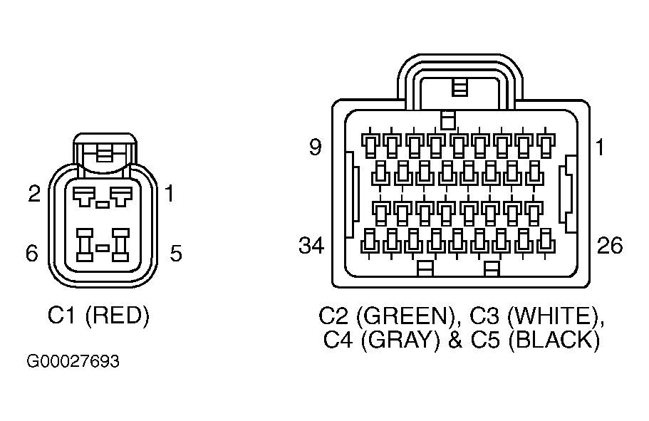 - Locate Body Control Module (BCM) and disconnect connector C5. See COMPONENT LOCATIONS . See Figure . Using DVOM, measure resistance between ground and BCM connector C5 terminal No. 10 (Violet/Brown wire). If resistance is greater than 5 ohms, go to next step. If resistance is 5 ohms or less, repair short to ground in Violet/Brown wire.