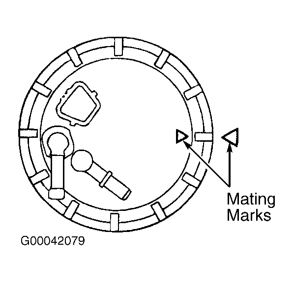 - Install fuel pump module in fuel tank. Align mating marks as shown in illustration. See Fig 2. Using Tank Cap Wrench (MB991480), tighten fuel pump module cap to specification. See TORQUE SPECIFICATIONS .