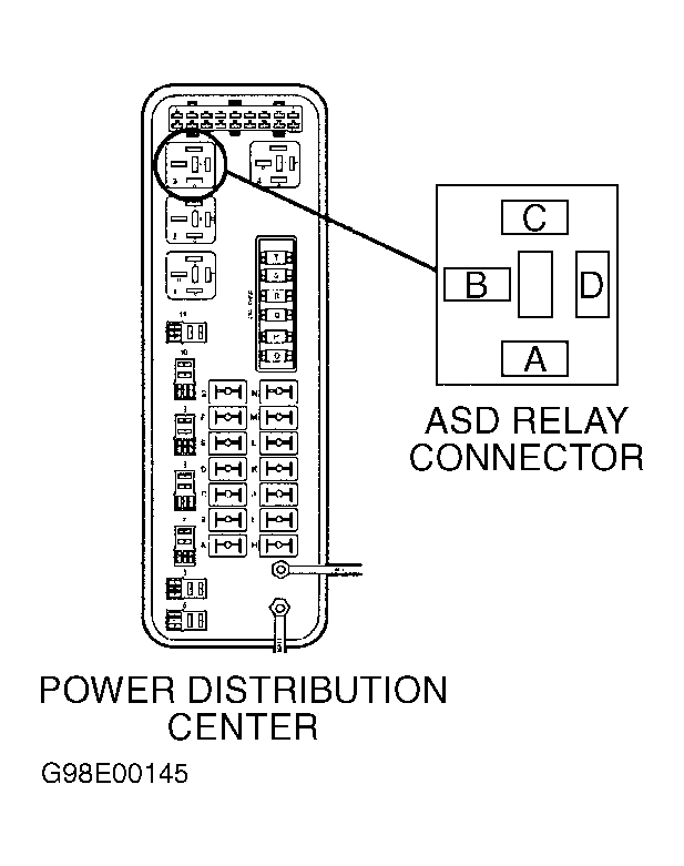 - Turn ignition off. Remove ASD relay from PDC. Turn ignition on. Measure voltage between ground and fused battery voltage circuit (Red/White wire) at ASD relay harness connector terminal "A". See Figure . If voltage is more than 11 volts, go to next step. If voltage is 11 volts or less, repair fused battery voltage circuit. See WIRING DIAGRAMS article.