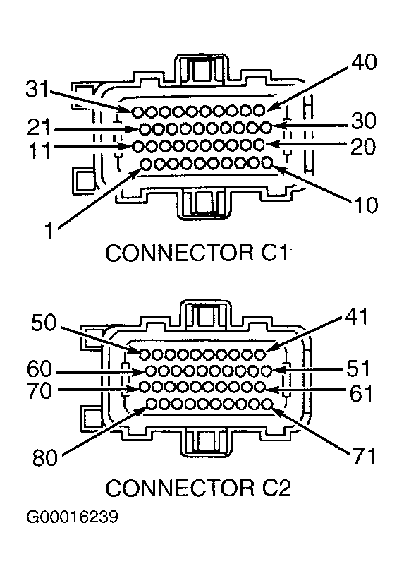 1. Turn ignition off. Disconnect PCM harness connectors. For PCM location, see PCM LOCATION  table. Connect a test light between ground and fused battery voltage circuit (Red/White wire) at PCM C2 harness connector terminal No. 46. See Fig 1 or Fig 2 . If test light illuminates brightly, go to next step. If test light does not illuminate brightly, repair open in fused battery voltage circuit.
