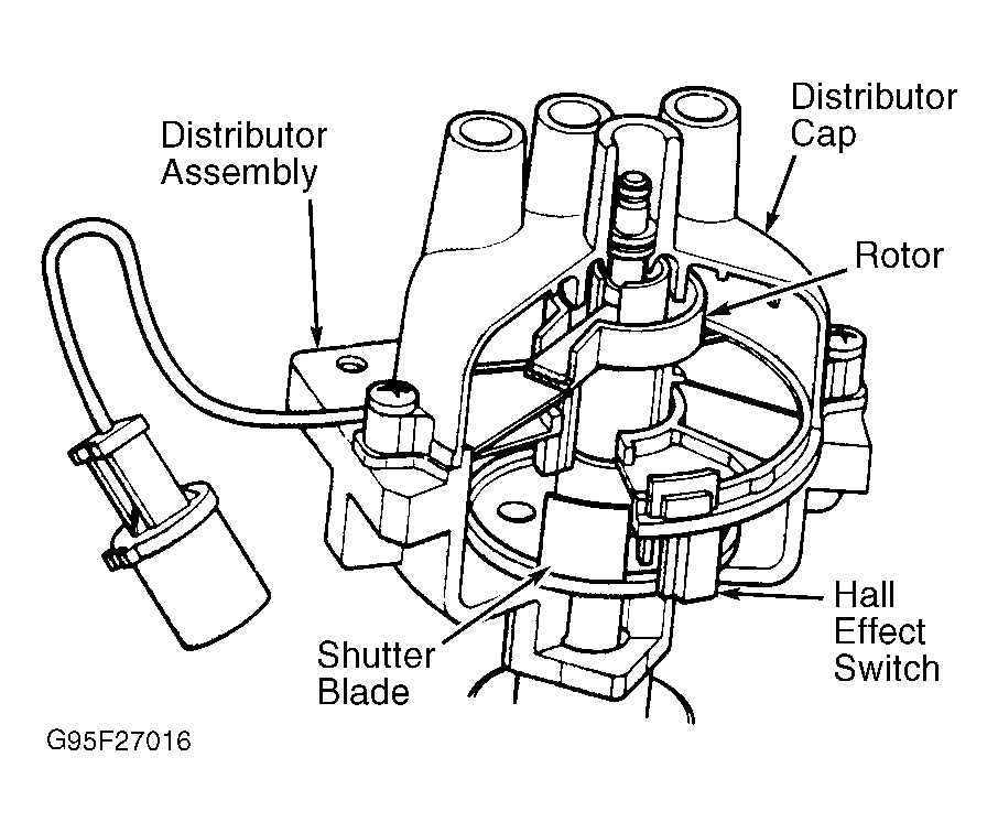 On models equipped with a distributor, CMP sensor is made up of a Hall Effect switch (sync signal generator) and a rotating pulse ring (shutter) on distributor shaft. See Fig 1 . On Distributorless Ignition System (DIS), CMP sensor reads slots in cam timing sprocket. ECM/PCM uses this information along with information from Crankshaft Position (CKP) sensor to determine if fuel injectors and ignition coils are properly sequenced for correct cylinders.