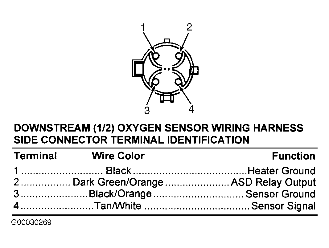5. Ensure 1/2 HO2S is still disconnected. Turn ignition on. Using scan tool, actuate O2 HEATER TEST. Measure voltage between ground and ASD relay output circuit (Dark Green/Orange wire) at 1/2 HO2S harness connector. If voltage is more than 11 volts, go to next step. If voltage is 11 volts or less, repair open in ASD relay output circuit.