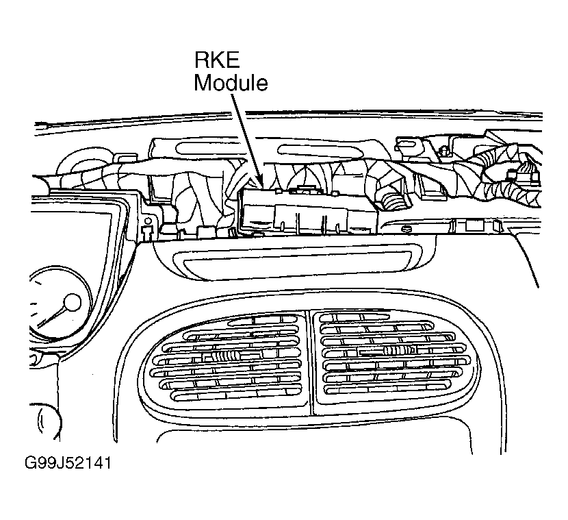 1. Ensure system is enabled before continuing. Turn ignition off. Disconnect Black 26-pin Remote Keyless Entry (RKE) module connector, located under center of instrument panel top cover. See Figure . Connect a jumper wire between RKE module connector terminal No. 17, Vehicle Theft Security System (VTSS) indicator driver circuit (Black/Orange wire) and ground. See Figure . If VTSS indicator does not illuminate, go to next step. If VTSS indicator illuminates, replace RKE module. See REMOTE KEYLESS ENTRY MODULE  under REMOVAL & INSTALLATION.