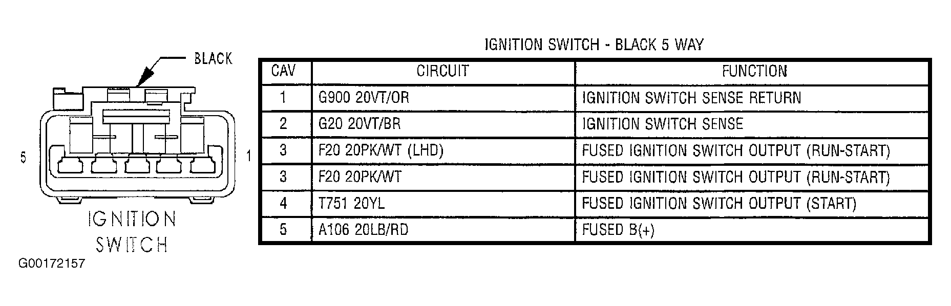 1. Turn ignition off. Disconnect ignition switch 5-pin connector. See Figure. Using scan tool, select SENSORS and monitor IGNITION SW voltage. If scan tool displays 0 volts, go to next step. If scan tool does not display 0 volts, replace ignition switch. See IGNITION SWITCH & LOCK CYLINDER under REMOVAL & INSTALLATION in STEERING COLUMN SWITCHES article.