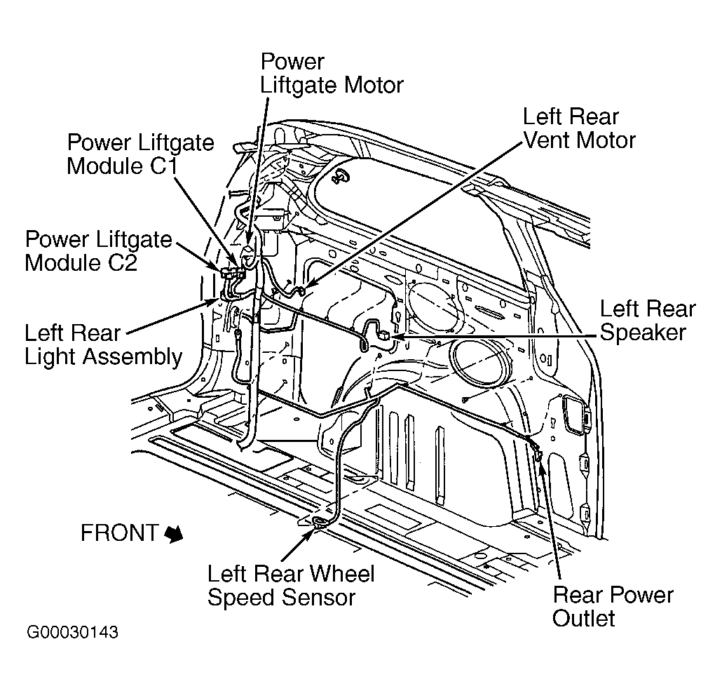 2. Disconnect Power Liftgate Module (PLGM) connector C2. See Fig 1. To access connector, left rear trim will need to be removed. See POWER LIFTGATE MODULE  under REMOVAL & INSTALLATION. Using DVOM, measure resistance between PLGM connector C2 terminals No. 16 (Violet/Light Blue wire) and No. 20 (Black/Light Green wire). See Figure. If resistance is not 1.2-382 k/ohms, go to next step. If resistance is 1.2-382 k/ohms, replace PLGM.