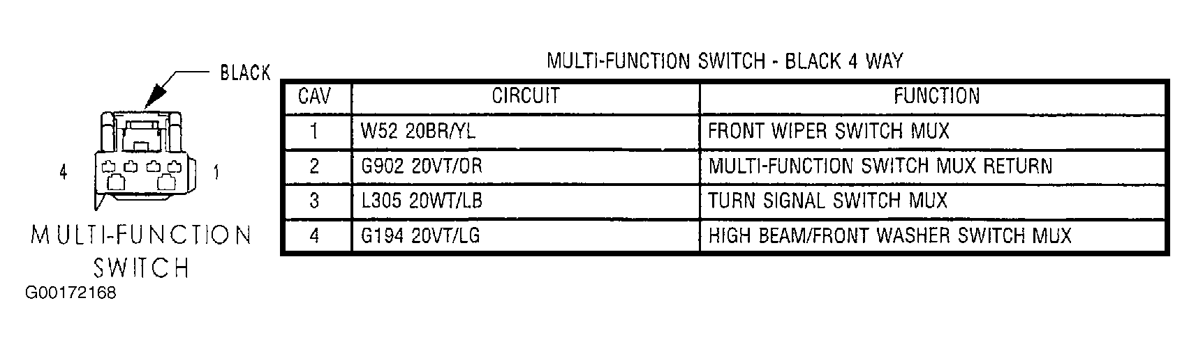 3. Turn the ignition off. Disconnect the Multi-Function Switch harness connector. See Figure. Disconnect the BCM C5 harness connector. See Figure. Measure the resistance between ground and the High Beam/Front Washer Switch MUX circuit. If the resistance is below 1000 ohms, repair the High Beam/Front Washer Switch MUX circuit for a short to ground. If the resistance is above 1000 ohms, replace the Front Control Module. See FRONT CONTROL MODULE  under REMOVAL & INSTALLATION.