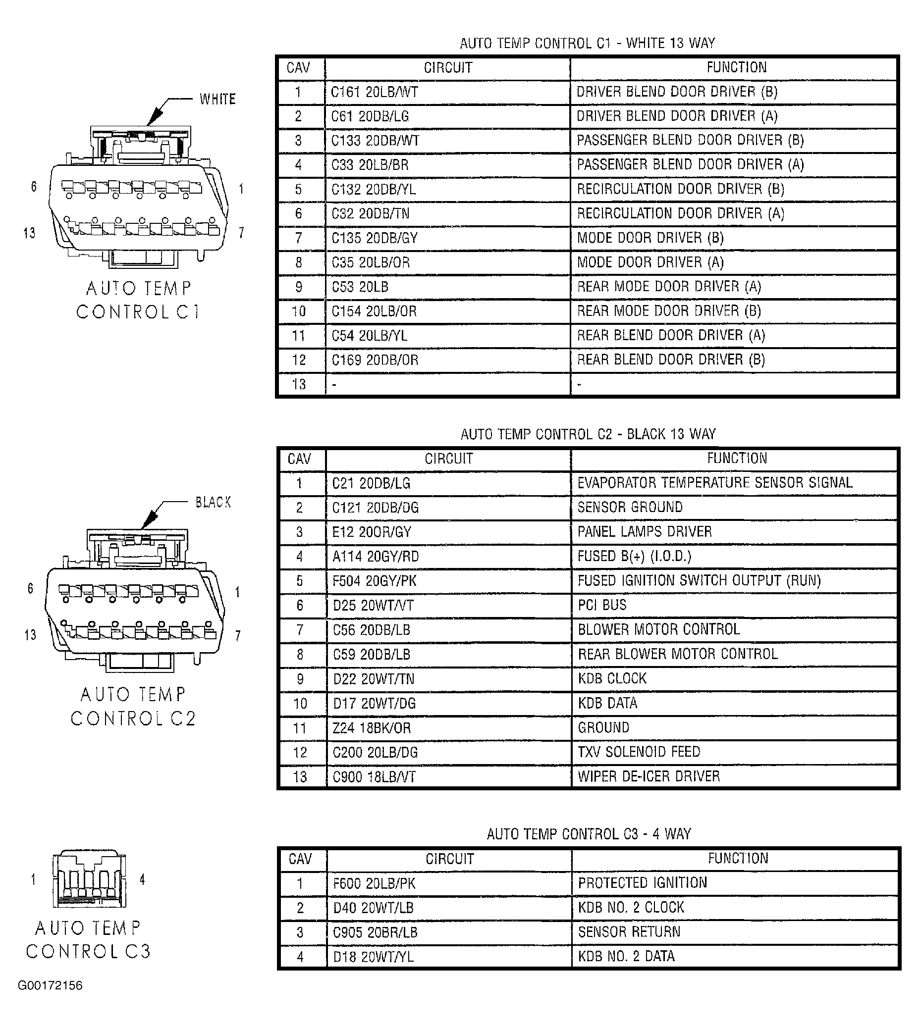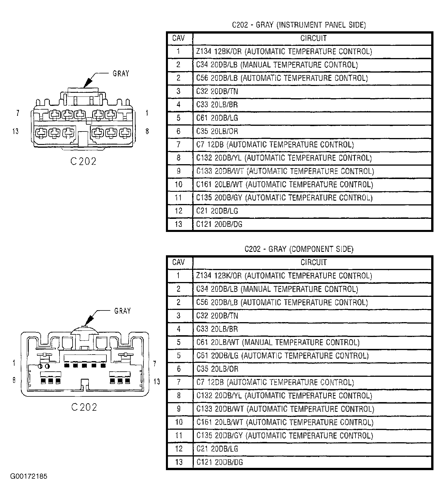 6. Turn the ignition off. Disconnect the ATC C2 harness connector. See Figure. Disconnect the in-line C202 harness connector. See Figure. Measure the resistance of the Sensor Ground circuit between the ATC C2 harness connector and the in-line C202 harness connector. If the resistance is below 5 ohms, check the wiring harness between the in-line C202 harness connector (plenum side) and the Evap Temp Sensor for an open. Repair as necessary. If OK, replace the Evaporator Temperature Sensor. See appropriate AUTOMATIC A/C-HEATER SYSTEMS article in HVAC. With the DRBIII®, reset the ATC after repair/replacement is complete. If the resistance is above 5 ohms, repair the Sensor Ground circuit between the ATC C2 harness connector and the in-line C202 harness connector (HVAC side) for an open. With the DRBIII®, reset the ATC after repair/replacement is complete.