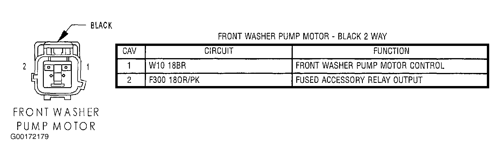 3. Turn the ignition off to the lock position. Disconnect the Front Washer Pump Motor harness connector. See Fig 1. Check connectors - clean/repair as necessary. Ignition on, engine off. Using a 12-volt test light connected to ground, check the Fused Accessory Relay Output circuit in the Front Washer Pump Motor harness connector. If the test light illuminates brightly, go to the next step. If the test light does not illuminate brightly, repair the Fused Accessory Relay Output circuit for an open.