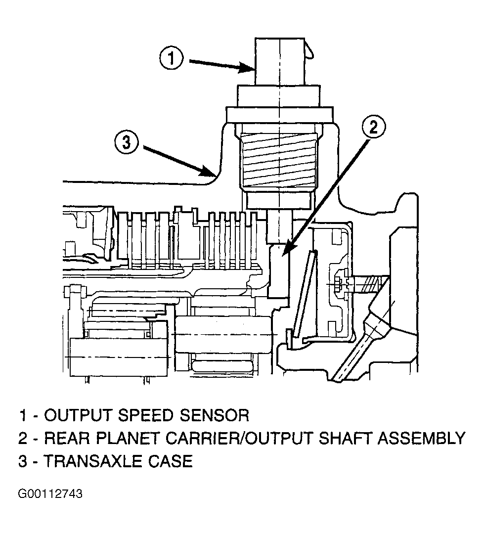 The output speed sensor is a two-wire magnetic pickup device that generates an AC voltage signal as rotation occurs. It is threaded into the transaxle case and sealed with an "O" ring. See Figure . The sensor is considered a primary input to the Powertrain Control Module (PCM). The output speed sensor provides information on how fast the output shaft is rotating. As the rear planetary carrier park pawl lugs pass by the sensor coil, an AC voltage is generated and sent to the PCM. See Fig 1 . The PCM interprets this information as output shaft RPM.
